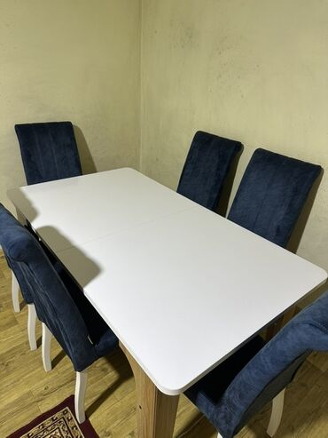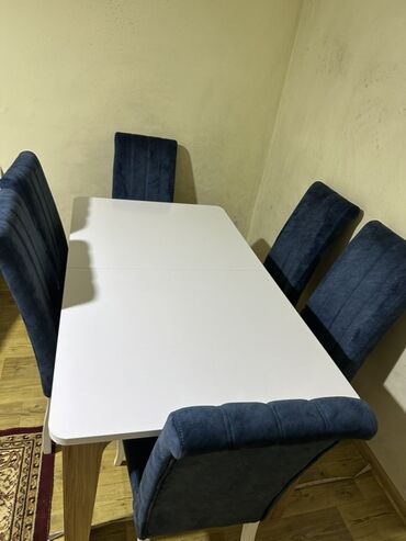 - Yemək masası və stulları: Açar ağ rəngdə düzbucaqlı masa, yumru künclər, açıq ağac tonlu möhkəm ayaqlar. 6 ədəd stul – mavi parça üzlü, yastıqlı oturacaq və bel hissəsi, ağ rəngli ayaqlar. Masa 6 nəfər üçün rahatdır, stullar masanın altına tam girir.