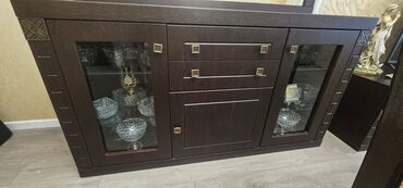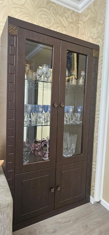 - Şkaf-vitrin: iki ədəd şüşə qapılı üst bölmə, içəridə şüşə rəflər; aşağıda qapalı bölmələr. Dekorativ kvadrat tutacaqlar və künc naxış elementləri.