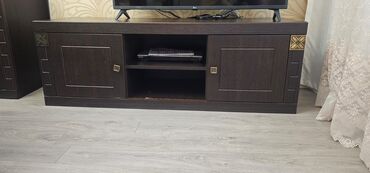 - TV tumbası: ortada açıq iki rəf, sağ-sol qapalı bölmələr; eyni üslubda tutacaqlar və künc dekorları.