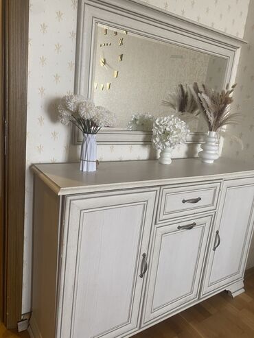 Klassik üslubda krem rəngli mebel dəsti - Şkaf: İkiqat şüşəli qapı, aşağıda iki geniş siyirmə. Qızılı dekorativ kənarlar, metal ornamentli tutacaqlar, təkərli ayaqlar. - Konsol-güzgü: Dalğalı form...