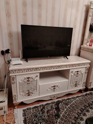 - Ölçü təxmini: hündürlük ~65–75 sm, uzunluq ~140–160 sm, dərinlik ~40–45 sm (TV üçün geniş üst səth)