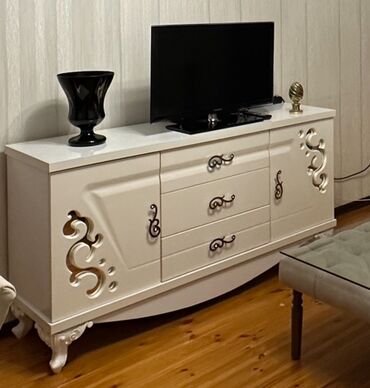 Klassik üslubda qonaq otağı mebel dəsti Tərkib: - TV altlığı: üst səth TV üçün, ortada açıq rəf, altda geniş çekmece. Ön və ayaqlarda qızılı barokko naxışlar, dekorativ tutacaqlar. - Bufet-komod g...