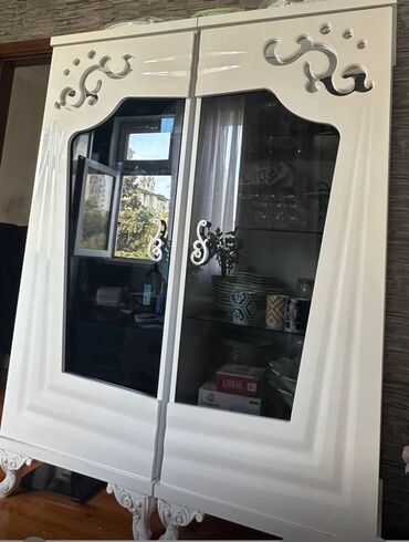Ağ rəngli qonaq otağı mebel dəsti Tərkibi: - İki bölməli böyük vitrin: şüşə qapılar, 2 ədəd tənzimlənən şüşə rəf, aşağıda qapalı dolab hissəsi. Dekorativ qızılı xəttlər və qızılı sapla asan açılan...