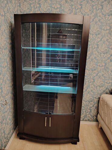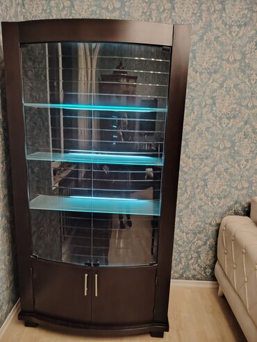 - Material: MDF/taxta karkas, şüşə fasad və rəflər