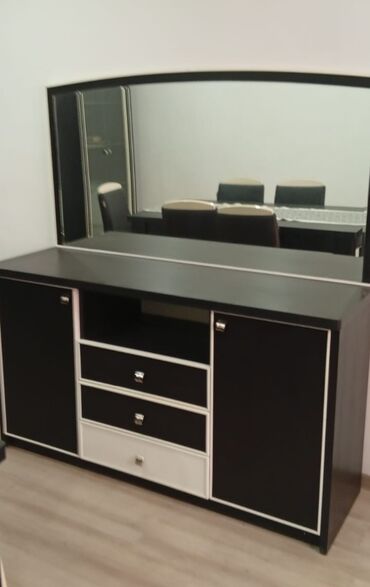 Qonaq otağı üçün mebel dəsti - Komod + böyük dekorativ güzgü: Geniş üst səth, 4 qapılı aşağı şöbə. Parlaq qara fasad, iri dekorativ tutacaqlar, yuxarıda iri, faset kənarlı, qeyri-ənənəvi formalı g...