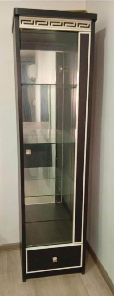 Şüşəli vitrin və komod dəsti Xüsusiyyətlər: - Rəng: qara-ağ, qızılı naxış dekorları - Vitrin: 3 səviyyəli şüşə rəflər, ön hissə tam şüşə qapılı; alt hissədə 2 geniş çekmece - Komod: sağ tərəfdə 2 ...