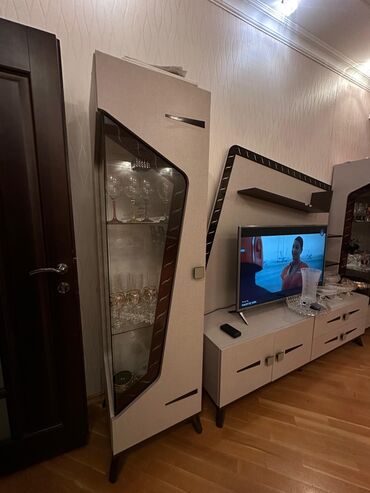 Modul tipli yumşaq mebel dəsti - Rəng: açıq bej - Kompozisiya: bir neçə ayrı modul (iki oturacaqlı bölmələr, künc modulu və araya yerləşdirilən ağ rəngli masa/konso lmodulu) - Komplektə uyğun 4 əd...