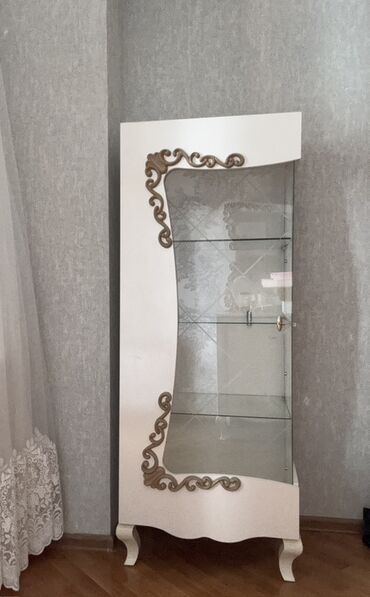 Qonaq otağı üçün vitrinli dəst və TV stendi Tərkib: - 2 ədəd şüşəli vitrin şkafı: biri ikiqapılı, biri təkqapılı. Hər ikisində içəridə şüşə rəflər, dekorativ qızılı elementlər və klassik naxışlı t...