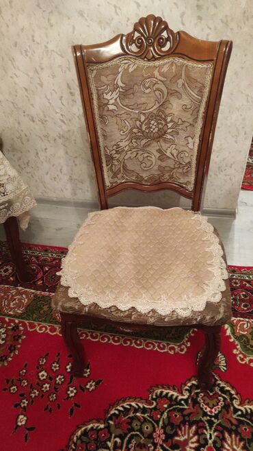 - Stul: Taxta karkas, klassik oyma başlıq və ayaqlar. Arxa dayaqda ornamentli parça, oturacaqda krem rəngli toxumalı/bağlama örtük. Qonaq masası ilə uyğun taxta rəng.