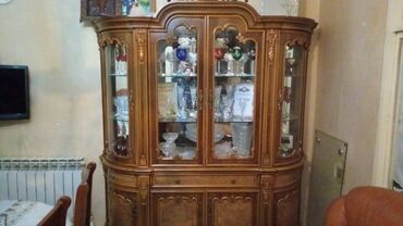 - Servant-vitrin: Böyük ölçülü, qövslü üst hissə və oyma dekor. Orta hissədə şüşəli vitrin qapıları və şüşə rəflər; yan tərəflər də vitrindir. Aşağıda qapalı bölmələr və çekmecələr saxlanma üçün. Klassik qəhvəyi taxta finiş, relyefli panellər.