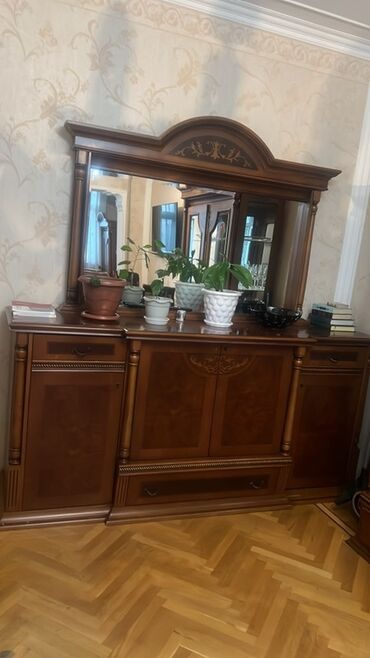 Klassik üslubda taxtadan hazırlanmış mebel dəsti Tərkibi: - Geniş güzgülü konsol/komod: üstü naxışlı çərçivəli böyük güzgü, ön və yanlarda oyma dekor, mərkəzdə çekmece, aşağı hissədə 2 qapılı bölm...