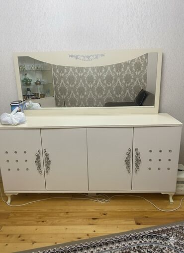 Klassik üslubda dekorativ güzgülü bufet/konsol dəsti. - Ön hissədə iri ölçülü güzgü paneli, tağvari dekor xətti və qızılı rəngdə ornamentlər - Aşağı hissə: 4 qapılı şkaf bölməsi; hamar krem rəngli...