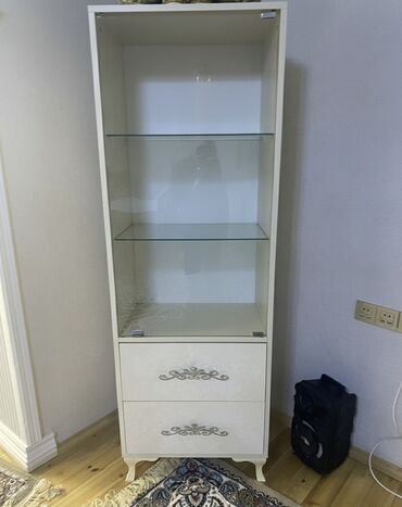 - İki vitrina şkafı: hər birində 2 şüşə rəf və altda 2 geniş çekmece. Şüşə rəflər kolleksiya, qab-qacaq və aksesuar nümayişi üçün uyğundur.