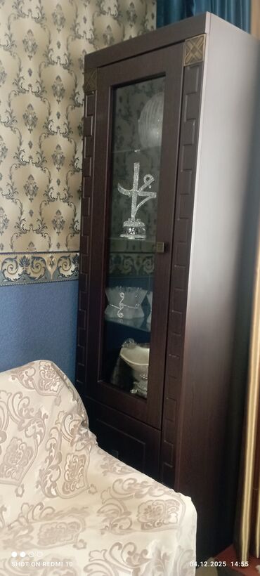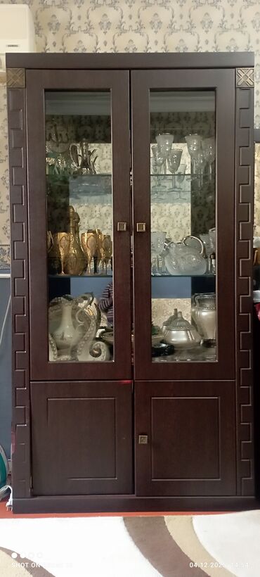 1) İkiqapılı iri vitrin şkaf – yuxarı hissə tam şüşəli, içəridə şüşə rəflər; aşağı hissə qapalı bölmə.