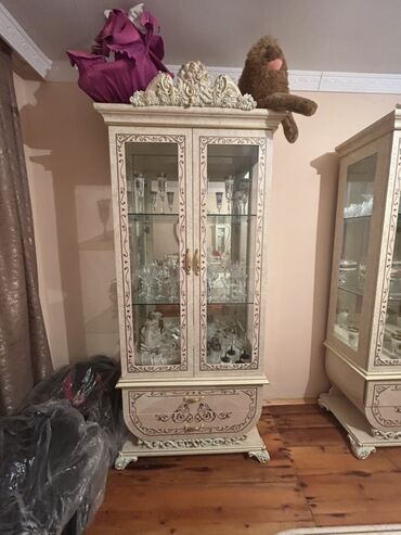 Klassik üslubda dəst mebel Tərkib: - 2 ədəd vitrin şkafı: şüşə qapılı, iç hissəsi düyməli kapteri dizaynlı, şüşə rəflərlə. Ön və aşağı hissələrdə oyma ornamentlər, qızılı vurğular. Qapılar metal h...