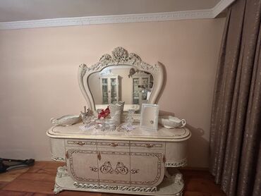 Klassik üslubda qonaq otağı mebel dəsti Tərkibi: - Böyük güzgülü konsol/komod – mərmər görünümlü üst səth, 4 qapılı geniş saxlama bölməsi, dekorativ relyeflər və qızılı bəzəklər. Üstündə böyük ölç...