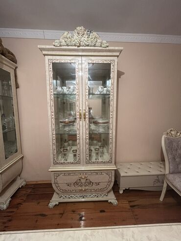 Klassik üslubda qonaq otağı dəsti Tərkibi: - Vitrin/servant dolabı: krem rəngli korpus, qızılı haşiyələr və oyma dekorlar. Aşağı hissədə ornamentli oval medalyon, dekorativ ayaqlar. Vitrin hissəsi...