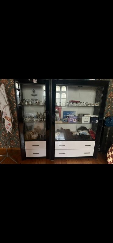 - 2 ədəd vitrindən ibarət şkaf: ön hissə şüşəli, içəridə 3 səviyyəli rəf; aşağı hissədə hər vitrində 2 geniş çekmece. Korpus qara, çekmecələr ağ, metal tutacaqlar.