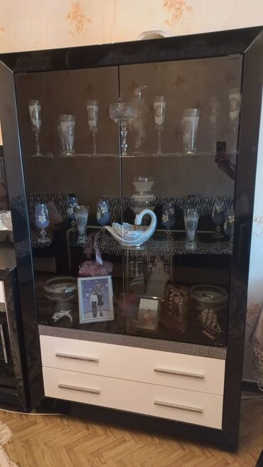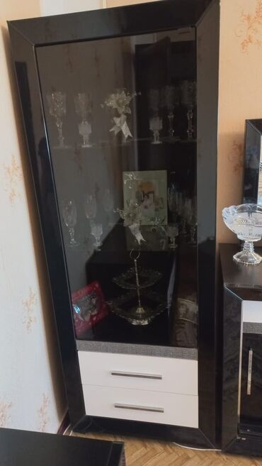1) Geniş vitrin şkaf – önü tünt şüşəli, içəridə şüşə rəflər; altda 2 böyük çekmece