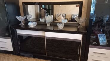 3) Bufet/komod – üstündə iri çərçivəli güzgü; sürüşkən qapılı geniş bölmə və açıq səth