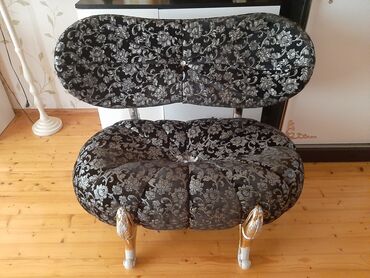 - Qonaq otağı üçün dekorativ kreslo: Qara rəngli, gümüşü çiçək naxışlı parça ilə çəkilmiş yumşaq oturacaq və bel hissəsi. Metal konstruksiyalı gövdə, ön tərəfdə dekorativ xrom rəngli heyvani formalı ayaqlar, arxada təkərli dayaqlar. Ellips formalı bel və oturacaq yastıqları, yumru tikiş detallarına malikdir. Klassik–barokko üslublu, interyerə vurğu qatmaq üçün ideal.