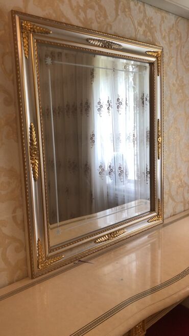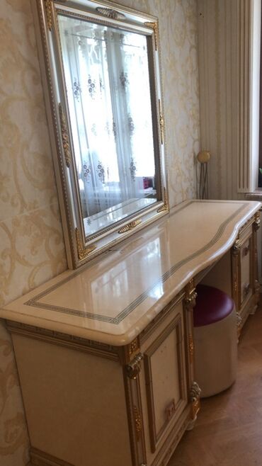 - Ölçülər (təxmini, şəkillərə əsasən): güzgü böyük format, masa uzun – geniş iş səthi ilə.