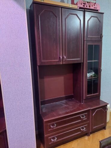 pulsuz köhnə stenka mebel televizor altıda var istəyən gəlsin havayı aparsın - Material: tünd qırmızı-qəhvəyi rəngdə laminat/taxta görünüşlü korpus, dekorativ oyma panellər. - Komplekt: bir neçə ş...