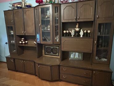 - Vitrinlər: 4 şüşə qapılı bölmə (yanlarda və mərkəzdə), içəridə şüşə rəflər – qab-qacaq, suvenir və dekor üçün