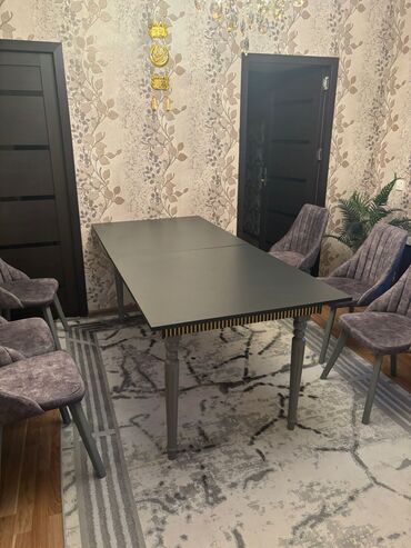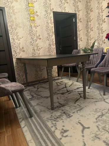 Klassik oyma üslublu ayaqlara və antrasit rəngli müasir üst səthə malik, qızılı aktsentlərlə tamamlanan şık yemək masası. Ailə yeməkləri və qonaq qəbul etmək üçün estetik və rahat həll. İstənilən neytral və ya tünd mebel dəsti ilə asan uyğunlaşır.