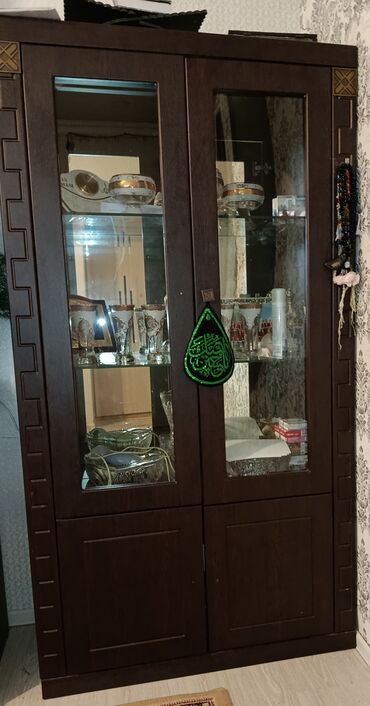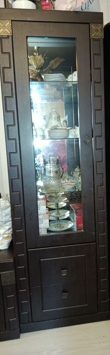 Qonaq otağı üçün mebel dəsti - Material: tünd qəhvəyi rəngdə MDF/laminat karkas, dekorativ künc elementləri, şüşə vitrin qapıları. - Komplekt tərkibi: 1) İkiqapılı iri vitrin şkaf – yuxarı hissə...