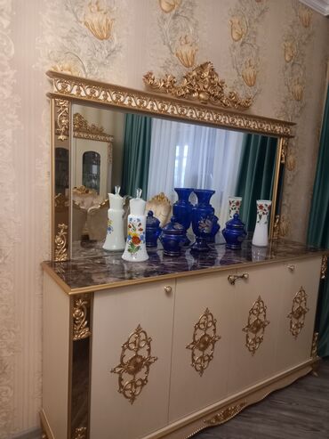 2) Geniş bufet-komod – dörd qapılı saxlama bölmələri, mərmər naxışlı üst tabla, böyük dekorativ güzgü (taçlı çərçivə, qızılı oymalar).
