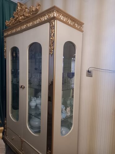 1) Şüşəli vitrin şkafı – üç bölməli, şüşə rəflər, dekorativ üst taç və qızılı relyeflər; aşağı hissədə əlavə saxlama üçün qapalı bölmə/çəkmə.