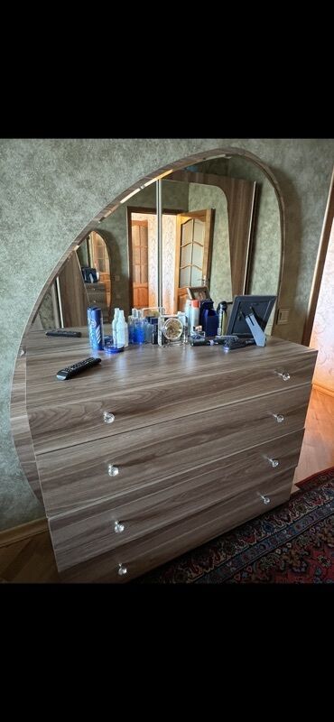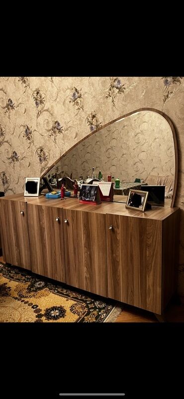 Klassik tərzdə qonaq otağı mebel dəsti Tərkibi: - Geniş komod və böyük divar güzgüsü: üst hissədə dekor üçün geniş səth, mərkəzdə 4 ədəd çəkmece, hər iki yanda qapalı dolab. Metalkenarlı tutacaqla...