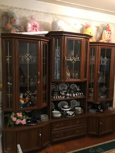 Qonaq otağı üçün dəst mebel - Dəst tərkibi: - Şüşəli vitrin şkafı (2 qapılı, içəridə şüşə rəflər, aşağı hissədə dekorativ düyməli geniş çəkmece/bölmə) - TV altlığı/mediastend (sol tərəfdə açıq...