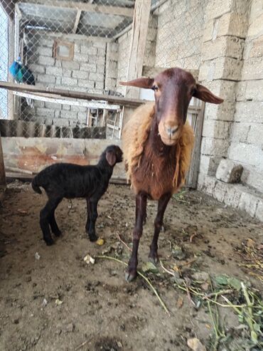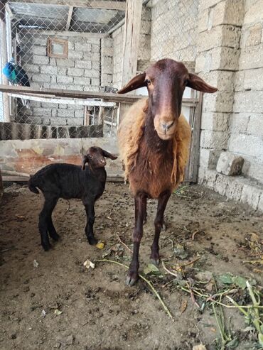 Qaradonuz-qəhvəyi quzu və ana qoyun - Cins: yerli yağlı quyruq tipli (fotoşəkildə quzu və anası görünür) - Rəng: quzu – tünd qəhvəyi/qaradonuz, ana – açıq qızılı-qəhvəyi - Yaş: quzu – gənc (hələ a...