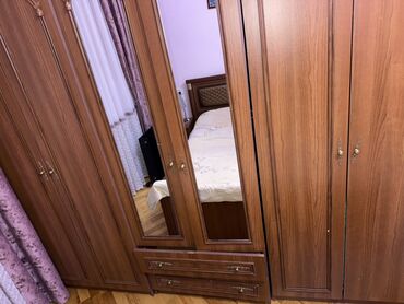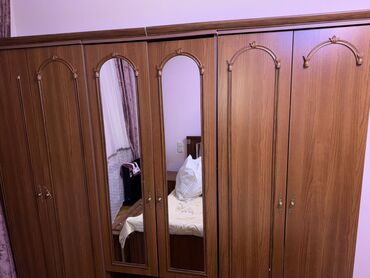 - Geniş paltar şkafı: çox bölməli, asılqan hissələri, rəflər və iki ədəd şüşəli güzgü qapısı; aşağı hissədə çekmecələr.