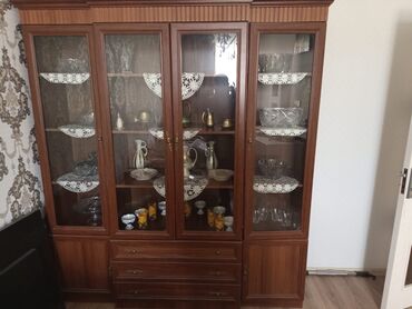Qonaq otağı mebeli stol stulu da var Zərif naxışlar və vitrin bölmələri ilə bəzədilmiş, güzgü daxil olmaqla, tünd qəhvəyi rəngli taxta bufet dəsti. Dəst iki hissədən ibarətdir: güzgülü bufet və vit...