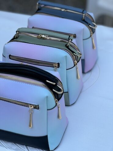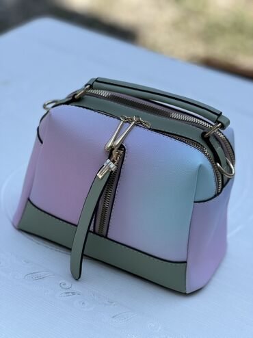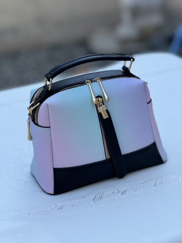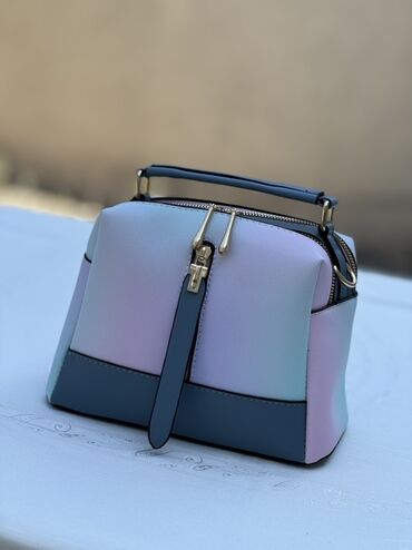 - Dizayn: Pastel tonlarda (mavi-bənövşəyi-çəhrayı) qradient korpus, kontrast rəngli sap və alt hissə. Qızılı rəngli metal furnitura, damcı formalı fermuar ucluqları.