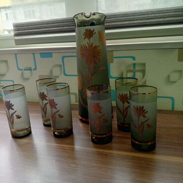 Şüşə sürahi və 4 stəkanlıq dəst, 30il öncə alınıb və işlənməyib - Material: keyfiyyətli şüşə - Rəng/görüntü: tutqun boz fon, qızılı naxışlı floral bəzəklər və qızılı haşiyələr - Komplekt: 1 ədəd h...