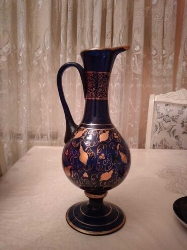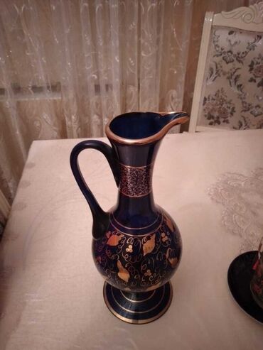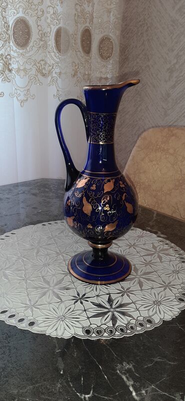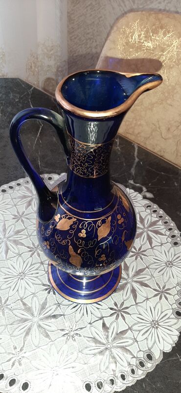 Kobalt şüşə dəsti. Böyük qrafin və 6 stəkan, dərin kobalt rəngində, əllə işlənmiş çiçək naxışı və qızılı elementlərlə bəzədilib. Su, şirə və ya kompot üçün zərif vintaj dəst, süfrənizə və interyeri...