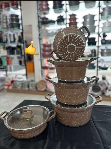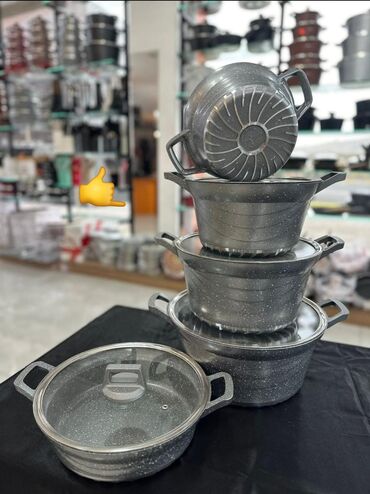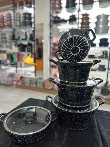 Qranit tava qazan desti Qranit örtüklü qazan və tava dəsti - Dəst tərkibi: 4 ədəd müxtəlif ölçülü qazan + 1 ədəd dərin tava Yenidir 1 defe olsun bele istifade olunmuyub karobka dan 2 defe acilib od...