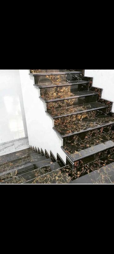 - Pilləkan komplekti: Qara fon üzərində qızılı və mis damarlı dekorativ naxışlı mərmər/plitə elementi. Addımlar, podstupen və yan pervaz detalları ilə eyni materialdan harmonik həll. Cilalanmış səth, interyerə premium görünüş qatır.