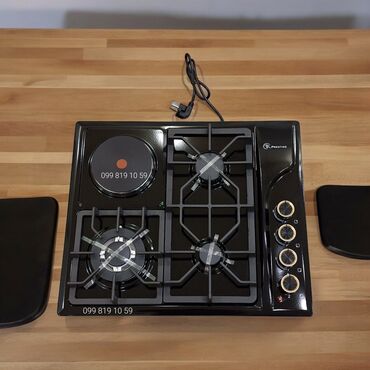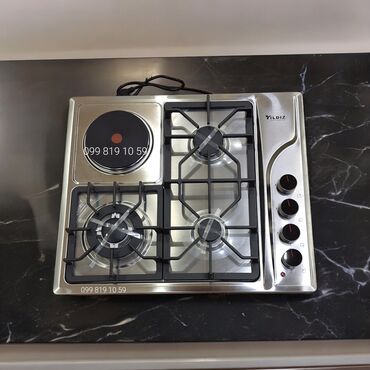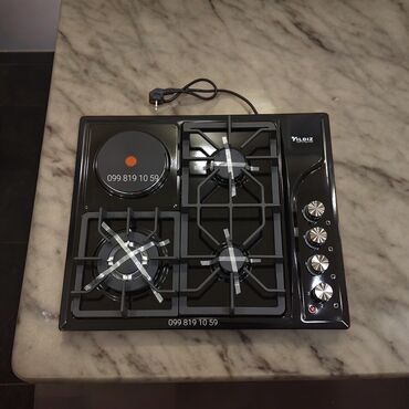 Quraşdırılan kombi tipli soba paneli – qaz + elektrik - 4 ocaq zonasından ibarət: 3 qaz gözüyü + 1 elektrik plitəsi (sol tərəfdə dairəvi “qırmızı nöqtəli” elektrik gözü). - Müxtəlif markalı varian...