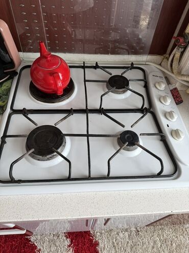 - Quraşdırılmış 4 gözlü qaz plitəsi (ağ panel, mexaniki idarəetmə düymələri)