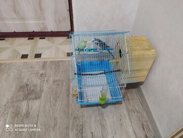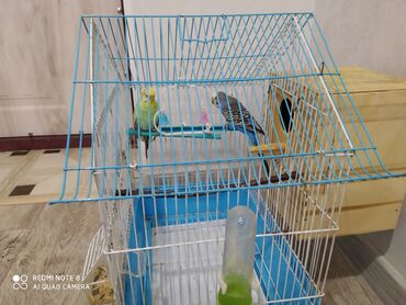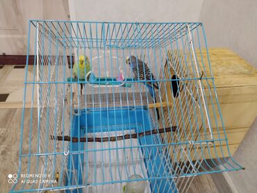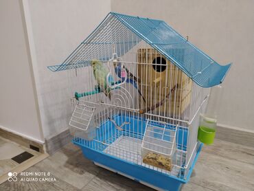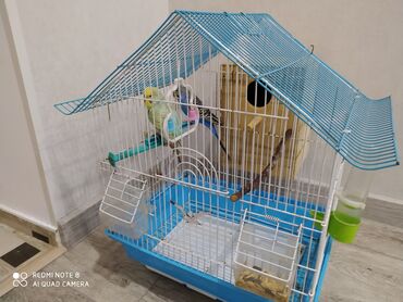 Dalğalı tutuquşular üçün tam dəst qəfəs - Rəng: mavi-ağ metal konstruksiya, plastik altlıq - Ölçü: orta həcmli, iki tutuquşu üçün rahat - Daxildir: - 2 ədəd dalğalı tutuquşu (yaşıl-sarı və göy-b...