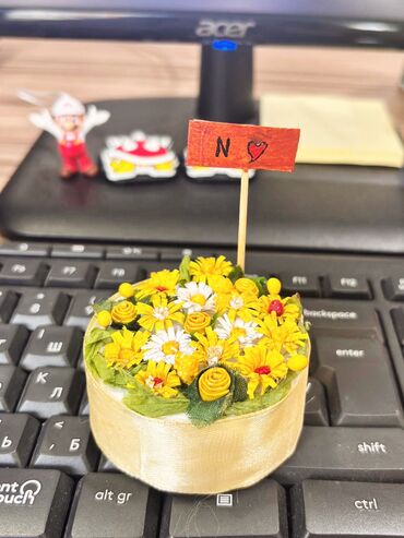 SarıMasaüstü çiçək dekor özəl sifarişlə.Sarı və ağ rəngli kiçik çiçəklərdən ibarət, yaşıl yarpaqlarla bəzədilmiş bəzəkli kompozisiya. Kompozisiya krem rəngli lentlə örtülmüş silindrik qutuya yerləşdirilib. Ortasında kiçik, taxta dirək üzərində "For You" yazısı olan narıncı rəngli lövhəcik var. Bu kompozisiya hər hansı bir masa və ya rəf üçün uyğun bir dekorativ elementdir.
