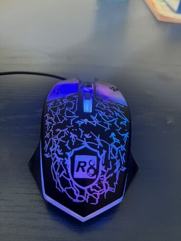 - Siçan: R8 loqolu, naxışlı korpus, çoxrəngli arxa işıqlandırma, USB kabel. DPI keçidi üçün üst düymə.