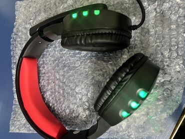 - Qulaqlıq-mikrofon: qulaqlıqların üzərində işıq effektləri, tənzimlənən taç, mikrofonlu, 3.5 mm audio + USB işıq üçün (şəkillərdə göstərilən konnektorlara əsasən).