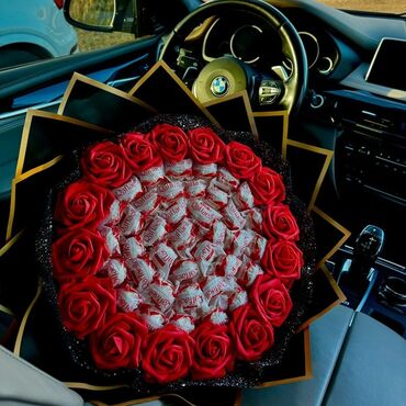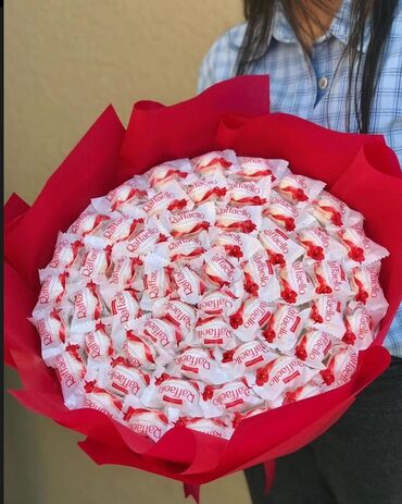 - Raffaello konfetlərindən hazırlanmış böyük buket: onlarla fərdi paketli Raffaello konfetləri dairəvi formada düzülür, kənarı qırmızı güllərlə bəzədilir. Qara parıltılı və qızılı haşiyəli premium büküm kağızı ilə tamamlanır. Romantik və şık təqdimat üçün ideal.