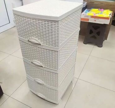 Plastik 4 çəkməcəli dolab - Material: möhkəm plastik - Rəng: bej-qəhvəyi kombinasiyası - Dizayn: səbət toxuması effektli ön panel, qəhvəyi qövs formalı tutacaqlar - Üst hissə düz və sərt – üzərin...
